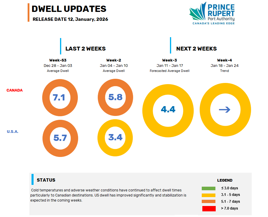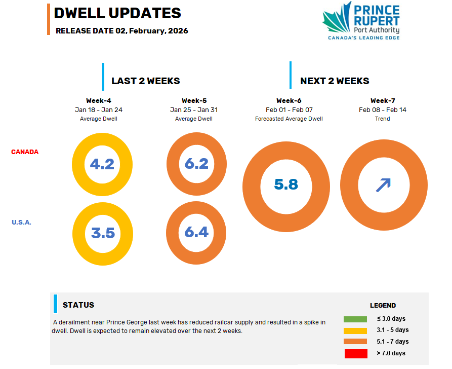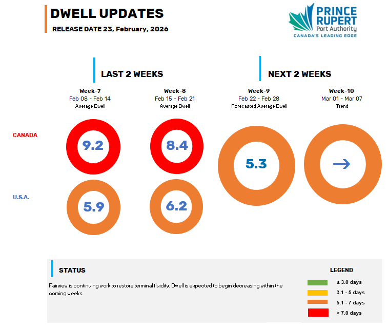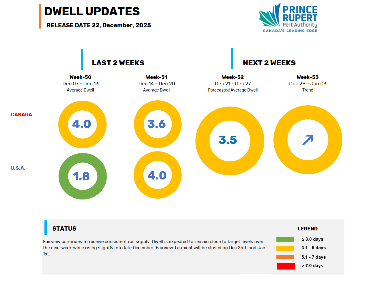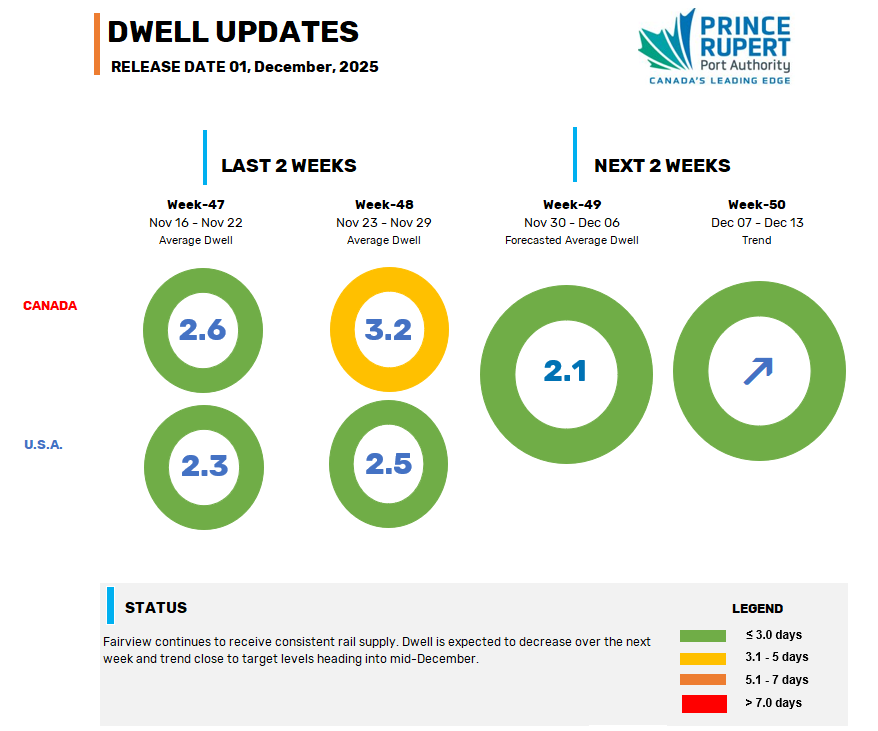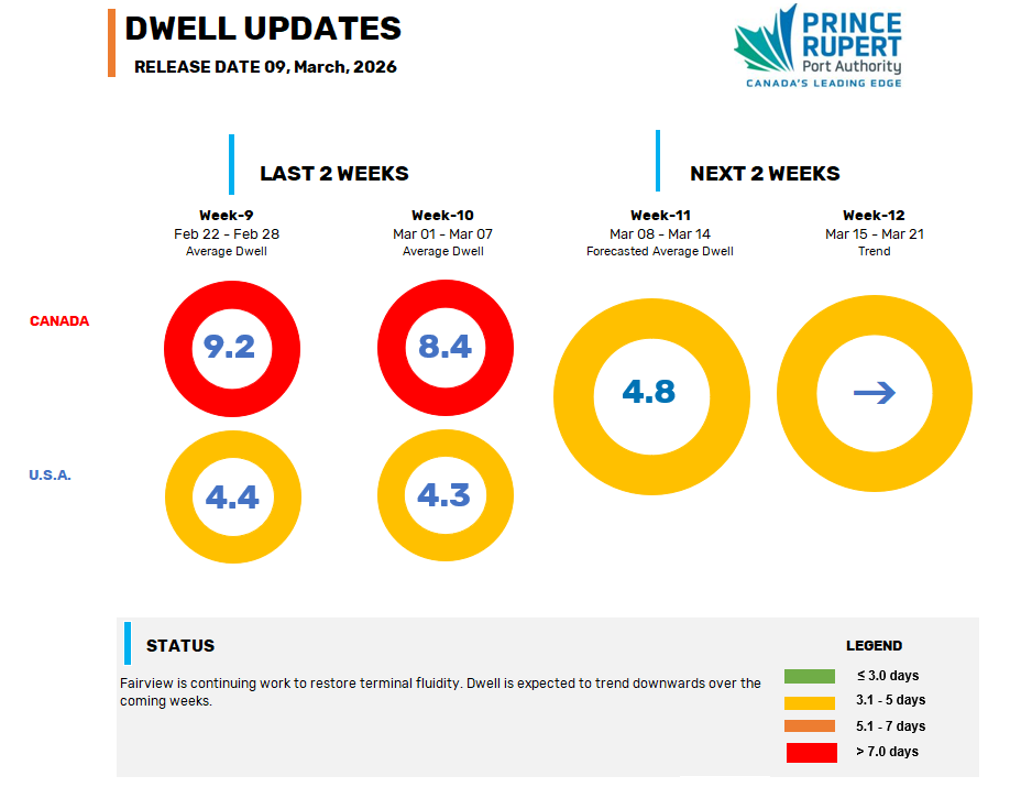 Check back here weekly for updates on dwell times and forecasted trends associated with cargo at the Fairview Container Terminal.