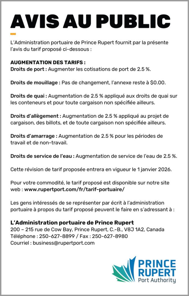 Pour toute question ou préoccupation, veuillez contacter l’Administration portuaire de Prince Rupert au sujet du tarif à l’adresse suivante :