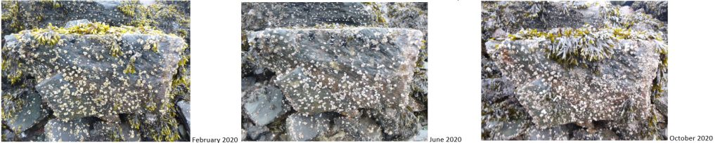 The Three Amigos Program was established in 2017 and uses the simple method of photo-documentation to monitor and describe ecological changes in local rocky intertidal areas over time. This monitoring program focuses on analyzing specific areas of the intertidal (usually a distinctive boulder) for the presence of rockweed, barnacles, and mussels (the three amigos) and the changes in their growth and abundance over time. Photos of each monitoring site are captured frequently and are compared by looking at both seasonal and annual differences in the species composition. The data collected helps to better understand the condition of rocky intertidal communities and the natural variation in the presence and abundance of the ‘three amigos’ over space and time. This monitoring program will also help assess impacts due to disturbance such as development or oil spills.